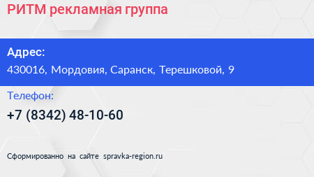 РИТМ, рекламная группа по адресу 430016, Мордовия, Саранск, Терешковой, 9 в дальнейшем Организация, размещена в следующих категориях: