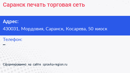 Саранск печать, торговая сеть по адресу 430031, Мордовия, Саранск, Косарева, 50 киоск в дальнейшем Организация, размещена в следующих категориях: