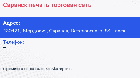 Саранск печать, торговая сеть по адресу 430421, Мордовия, Саранск, Веселовского, 84 киоск в дальнейшем Организация, размещена в следующих категориях: