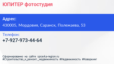 ЮПИТЕР, фотостудия по адресу 430005, Мордовия, Саранск, Полежаева, 53 в дальнейшем Организация, размещена в следующих категориях: