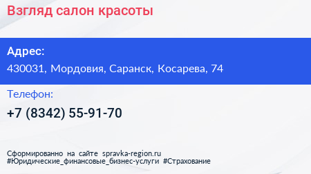 Взгляд, салон красоты по адресу 430031, Мордовия, Саранск, Косарева, 74 в дальнейшем Организация, размещена в следующих категориях: