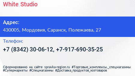 White Studio по адресу 430005, Мордовия, Саранск, Полежаева, 27 в дальнейшем Организация, размещена в следующих категориях: