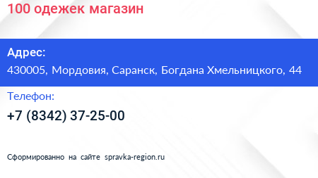 100 одежек, магазин по адресу 430005, Мордовия, Саранск, Богдана Хмельницкого, 44 в дальнейшем Организация, размещена в следующих категориях: