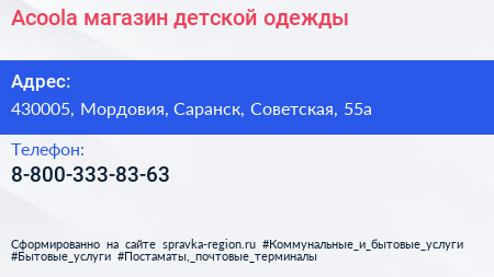 Acoola, магазин детской одежды по адресу 430005, Мордовия, Саранск, Советская, 55а в дальнейшем Организация, размещена в следующих категориях:
