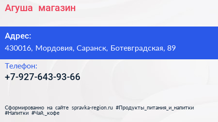 Агуша+, магазин по адресу 430016, Мордовия, Саранск, Ботевградская, 89 в дальнейшем Организация, размещена в следующих категориях: