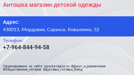Антошка, магазин детской одежды по адресу 430013, Мордовия, Саранск, Коваленко, 52 в дальнейшем Организация, размещена в следующих категориях: