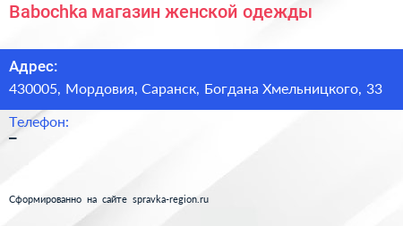 Babochka, магазин женской одежды по адресу 430005, Мордовия, Саранск, Богдана Хмельницкого, 33 в дальнейшем Организация, размещена в следующих категориях: