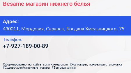 Besame, магазин нижнего белья по адресу 430011, Мордовия, Саранск, Богдана Хмельницкого, 75 в дальнейшем Организация, размещена в следующих категориях: