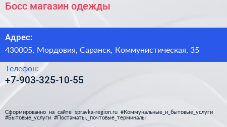 Босс, магазин одежды по адресу 430005, Мордовия, Саранск, Коммунистическая, 35 в дальнейшем Организация, размещена в следующих категориях: