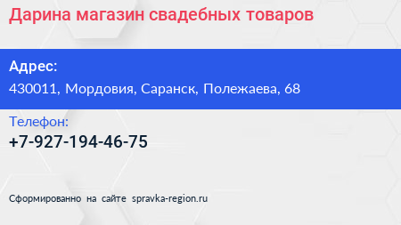 Дарина, магазин свадебных товаров по адресу 430011, Мордовия, Саранск, Полежаева, 68 в дальнейшем Организация, размещена в следующих категориях: