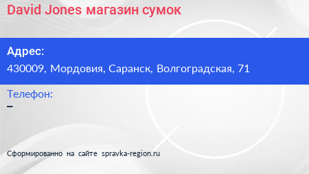 David Jones, магазин сумок по адресу 430009, Мордовия, Саранск, Волгоградская, 71 в дальнейшем Организация, размещена в следующих категориях: