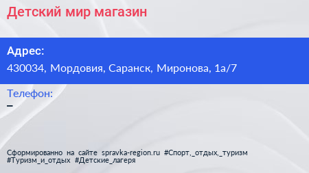 Детский мир, магазин по адресу 430034, Мордовия, Саранск, Миронова, 1а/7 в дальнейшем Организация, размещена в следующих категориях: