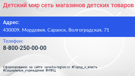 Детский мир, сеть магазинов детских товаров по адресу 430009, Мордовия, Саранск, Волгоградская, 71 в дальнейшем Организация, размещена в следующих категориях: