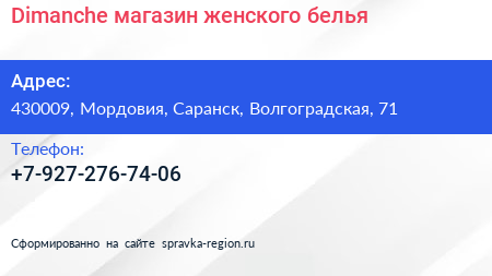 Dimanche, магазин женского белья по адресу 430009, Мордовия, Саранск, Волгоградская, 71 в дальнейшем Организация, размещена в следующих категориях: