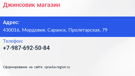 Джинсовик, магазин по адресу 430016, Мордовия, Саранск, Пролетарская, 79 в дальнейшем Организация, размещена в следующих категориях:
