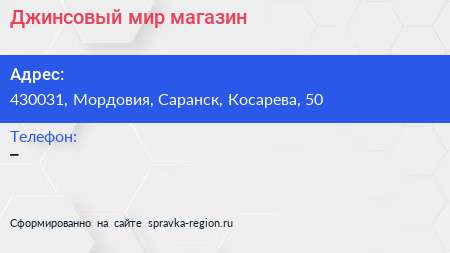 Джинсовый мир, магазин по адресу 430031, Мордовия, Саранск, Косарева, 50 в дальнейшем Организация, размещена в следующих категориях: