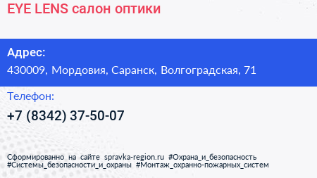 EYE LENS, салон оптики по адресу 430009, Мордовия, Саранск, Волгоградская, 71 в дальнейшем Организация, размещена в следующих категориях: