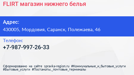 FLIRT, магазин нижнего белья по адресу 430005, Мордовия, Саранск, Полежаева, 46 в дальнейшем Организация, размещена в следующих категориях: