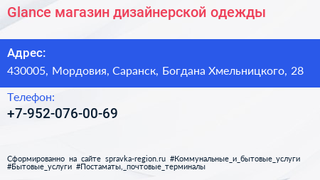 Glance, магазин дизайнерской одежды по адресу 430005, Мордовия, Саранск, Богдана Хмельницкого, 28 в дальнейшем Организация, размещена в следующих категориях: