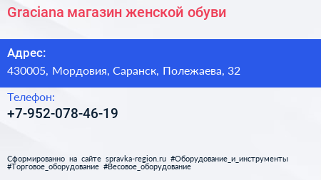 Graciana, магазин женской обуви по адресу 430005, Мордовия, Саранск, Полежаева, 32 в дальнейшем Организация, размещена в следующих категориях:
