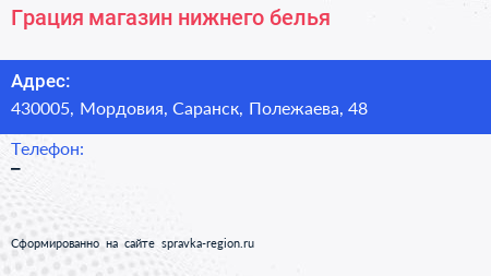 Грация, магазин нижнего белья по адресу 430005, Мордовия, Саранск, Полежаева, 48 в дальнейшем Организация, размещена в следующих категориях:
