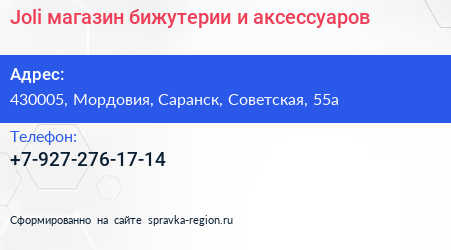 Joli, магазин бижутерии и аксессуаров по адресу 430005, Мордовия, Саранск, Советская, 55а в дальнейшем Организация, размещена в следующих категориях: