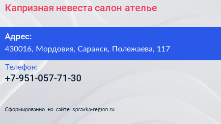 Капризная невеста, салон-ателье по адресу 430016, Мордовия, Саранск, Полежаева, 117 в дальнейшем Организация, размещена в следующих категориях: