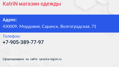 KatriN, магазин одежды по адресу 430009, Мордовия, Саранск, Волгоградская, 71 в дальнейшем Организация, размещена в следующих категориях: