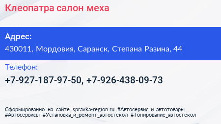 Клеопатра, салон меха по адресу 430011, Мордовия, Саранск, Степана Разина, 44 в дальнейшем Организация, размещена в следующих категориях: