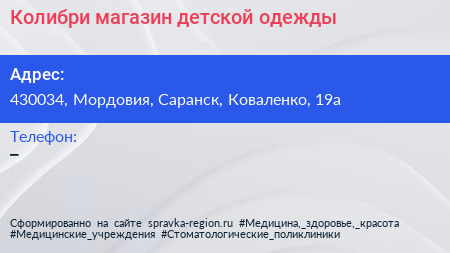Колибри, магазин детской одежды по адресу 430034, Мордовия, Саранск, Коваленко, 19а в дальнейшем Организация, размещена в следующих категориях: