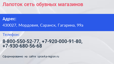 Лапоток, сеть обувных магазинов по адресу 430027, Мордовия, Саранск, Гагарина, 99а в дальнейшем Организация, размещена в следующих категориях: