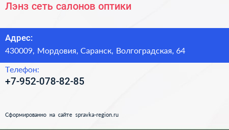 Лэнз, сеть салонов оптики по адресу 430009, Мордовия, Саранск, Волгоградская, 64 в дальнейшем Организация, размещена в следующих категориях: