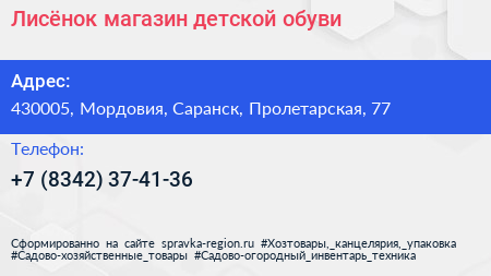 Лисёнок, магазин детской обуви по адресу 430005, Мордовия, Саранск, Пролетарская, 77 в дальнейшем Организация, размещена в следующих категориях: