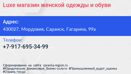Luxe, магазин женской одежды и обуви по адресу 430027, Мордовия, Саранск, Гагарина, 99а в дальнейшем Организация, размещена в следующих категориях: