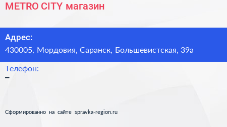 METRO-CITY, магазин по адресу 430005, Мордовия, Саранск, Большевистская, 39а в дальнейшем Организация, размещена в следующих категориях: