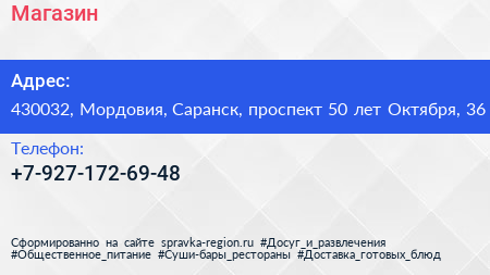 Магазин по адресу 430032, Мордовия, Саранск, проспект 50 лет Октября, 36 в дальнейшем Организация, размещена в следующих категориях: