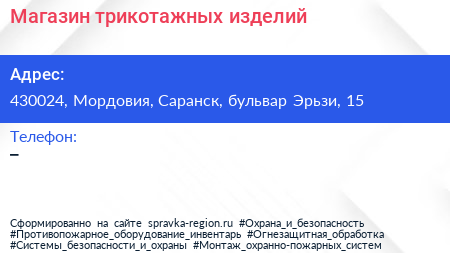 Магазин трикотажных изделий по адресу 430024, Мордовия, Саранск, бульвар Эрьзи, 15 в дальнейшем Организация, размещена в следующих категориях: