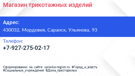Магазин трикотажных изделий по адресу 430032, Мордовия, Саранск, Ульянова, 93 в дальнейшем Организация, размещена в следующих категориях: