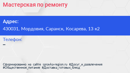 Мастерская по ремонту по адресу 430031, Мордовия, Саранск, Косарева, 13 к2 в дальнейшем Организация, размещена в следующих категориях: