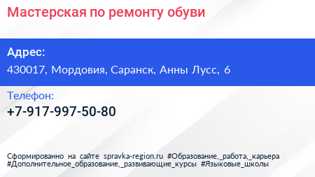 Мастерская по ремонту обуви по адресу 430017, Мордовия, Саранск, Анны Лусс, 6 в дальнейшем Организация, размещена в следующих категориях: