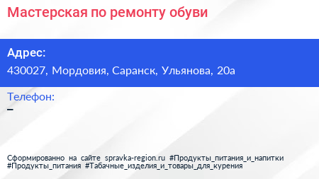 Мастерская по ремонту обуви по адресу 430027, Мордовия, Саранск, Ульянова, 20а в дальнейшем Организация, размещена в следующих категориях: