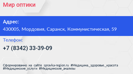 Мир оптики по адресу 430005, Мордовия, Саранск, Коммунистическая, 59 в дальнейшем Организация, размещена в следующих категориях: