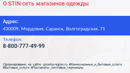 O`STIN, сеть магазинов одежды по адресу 430009, Мордовия, Саранск, Волгоградская, 71 в дальнейшем Организация, размещена в следующих категориях: