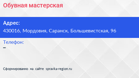 Обувная мастерская по адресу 430016, Мордовия, Саранск, Большевистская, 96 в дальнейшем Организация, размещена в следующих категориях: