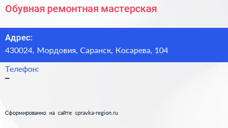 Обувная ремонтная мастерская по адресу 430024, Мордовия, Саранск, Косарева, 104 в дальнейшем Организация, размещена в следующих категориях: