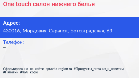One touch..., салон нижнего белья по адресу 430016, Мордовия, Саранск, Ботевградская, 63 в дальнейшем Организация, размещена в следующих категориях: