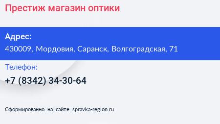 Престиж, магазин оптики по адресу 430009, Мордовия, Саранск, Волгоградская, 71 в дальнейшем Организация, размещена в следующих категориях: