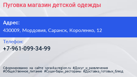Пуговка, магазин детской одежды по адресу 430009, Мордовия, Саранск, Короленко, 12 в дальнейшем Организация, размещена в следующих категориях: