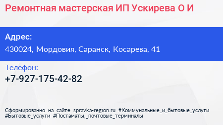 Ремонтная мастерская, ИП Ускирева О.И. по адресу 430024, Мордовия, Саранск, Косарева, 41 в дальнейшем Организация, размещена в следующих категориях: