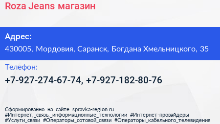 Roza Jeans, магазин по адресу 430005, Мордовия, Саранск, Богдана Хмельницкого, 35 в дальнейшем Организация, размещена в следующих категориях: